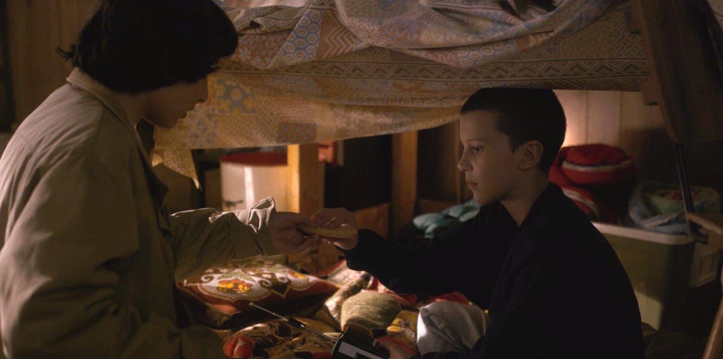 What about the second image? Here, we are in the Wheeler family home with Mike and Eleven. She has just escaped the nightmare lab and found refuge here. What a tonal shift. Instead of harsh overhead lighting, the lamplight glows in the background. It’s soft and gentle, inviting the viewer into the relationship of the scene. Even the color is different: warm gold instead of cold blue-white. Light interplays with shadow and subtly gilds the characters’ faces. Here, the atmosphere feels homey, warm, safe and natural. It provides a fitting setting for Mike to offer Eleven food, shelter, companionship and, most importantly, safety. There’s no need for her to run or hide anymore. She has escaped her hellish prison. She doesn’t have to fear. Eleven has passed from death to life.
