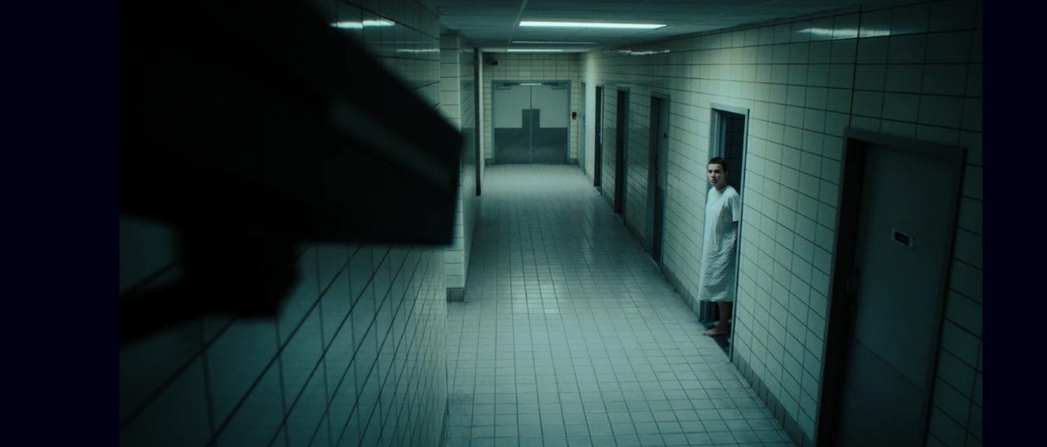 Look at the two sample images again. The first is the Hawkins Lab, where (spoilers but it’s been ten years so…) Eleven and other children were kept to be experimented upon for their abilities. The lighting is harsh and cold. Everything is the same: endless colorless hallways lit by fluorescent light, beaming from overhead so that there is no place to hide. No escape. The atmosphere is sterile, empty, disconcerting. Dystopian “hospital aesthetic” at its finest. The scene is meant to unsettle you, to convey a feeling of subtle danger and of always being watched. Zero variety, nothing but endless sameness. Psychological torture. Such a place is lifeless. Dead.